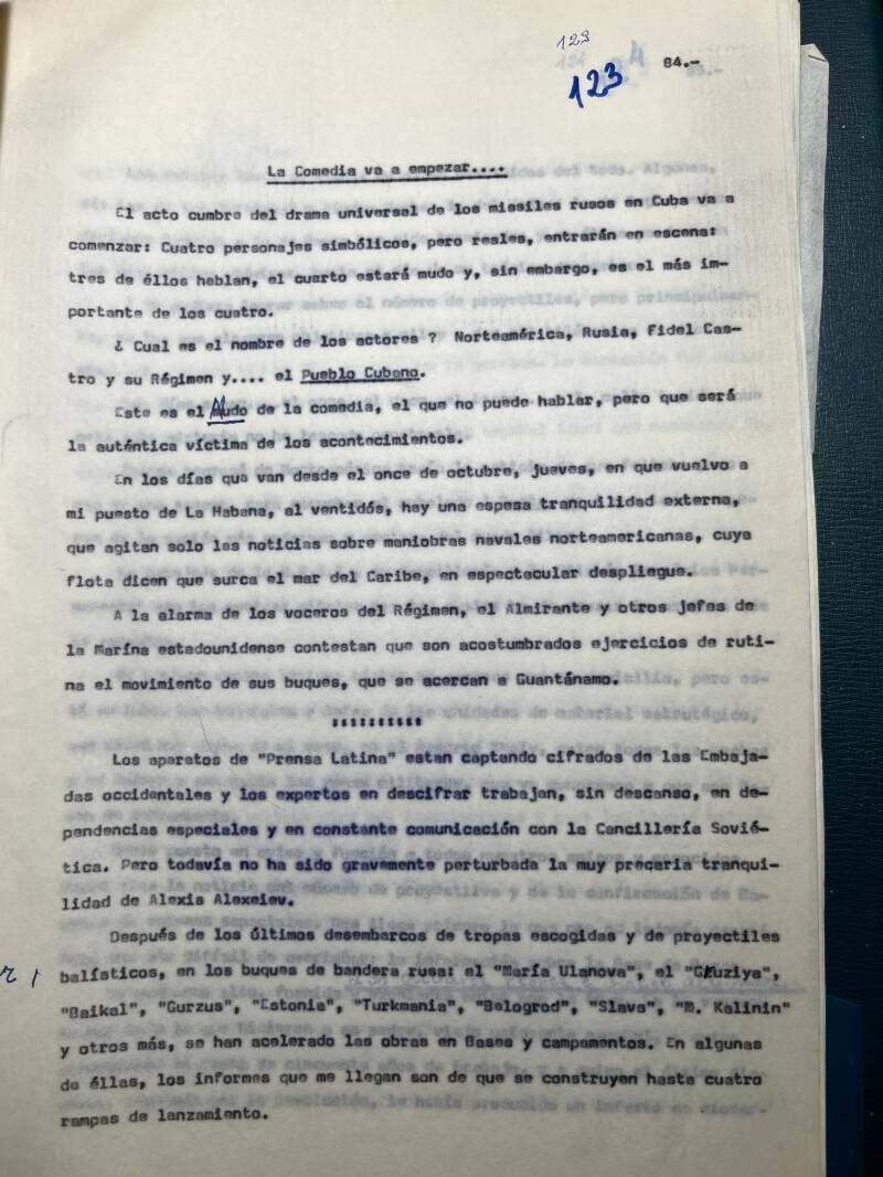 Aquí puedes ver algunas de las 269 cuartillas del documento inédito de Caldevilla. Este ensayo está basado en ellas y en los hechos que describe, varios de los cuales han sido contrastados y comprobados con los documentos, hasta hace poco secretos, y que han sido desclasificados por los gobiernos de Estados Unidos y Rusia. El delicado estado de estas páginas impidió escanearlas y fue necesario fotografiarlas, una por una, digitalizarlas y convertirlas en formato apropiado por imprimir. En todo este documento se ha estado trabajando durante meses. Su edición final está por concluir, mientras se coordina su publicación con sellos editoriales interesados. ESTOS DOCUMENTOS ESTAN A BUEN RECAUDO.